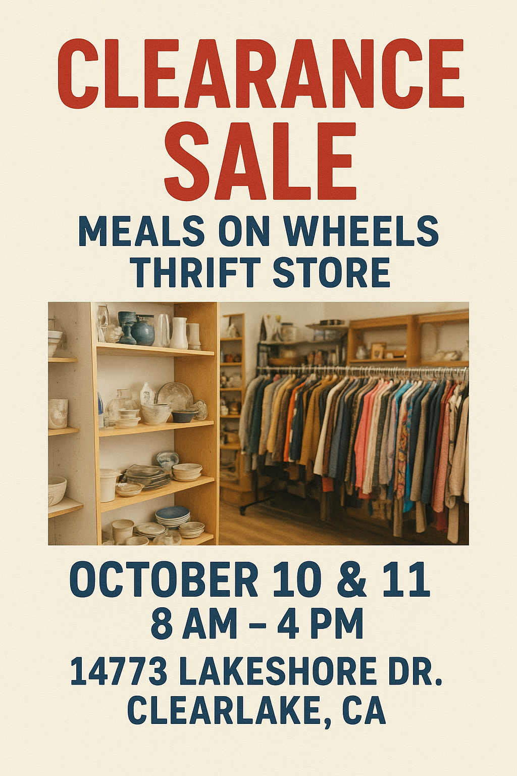 Net proceeds go to support the Meals On Wheels program of the Clearlake Senior Center/Highlands Senior Service Center